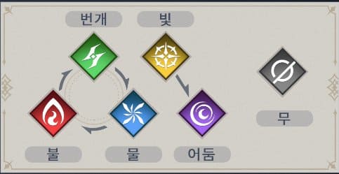 빛의 속성을 가진 가브리엘은 이런 속성에 대한 고민이 없습니다. 보통 다른 게임과 다르게 빛의 속성은 암흑속성에 상극 효과를 나타내고 암흑속성은 빛속성에게 아무런 메리트가 없기 때문입니다.