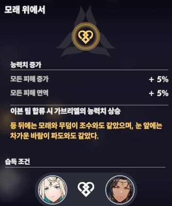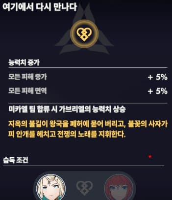 유대인질 능력으로 이븐과 미카엘을 보유하게 되면 모든 피해 증가 10%, 모든 피해 면역 10%를 얻게 됩니다. 게임 내에 가장 효과가 좋은 피해 증가, 면역은 탱커에게 단단함과 반격이라는 피해를 더욱 강하게 만들어 주는 능력입니다.