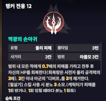 범위 내 모든 적에게 0.5배의 물리 방어력 -20%의 디버프를 부여합니다. 레벨이 오를수록 적군에게 방어력을 감소시켜 주는 디버프는 필수가 되어가고 있습니다. 방어력 디버프가 없다면 던전을 클리어하는데 어려움을 느끼고 있으실 겁니다. 탱커로서의 역할에 디버프도 사용할 수 있는 하이브리도 형태의 탱커입니다.