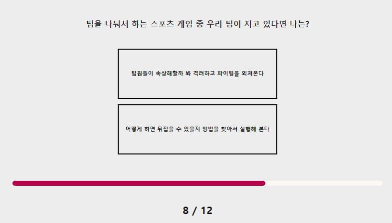 팀을 나눠서 하는 스포츠 게임 중 우리팀이 지고 있다면 팀원들을 격려하고 자존심을 올려주기 위해서 파이팅을 외쳐 볼 것 같아요 스포츠는 혼자 하는 게임이 아니기 때문이죠