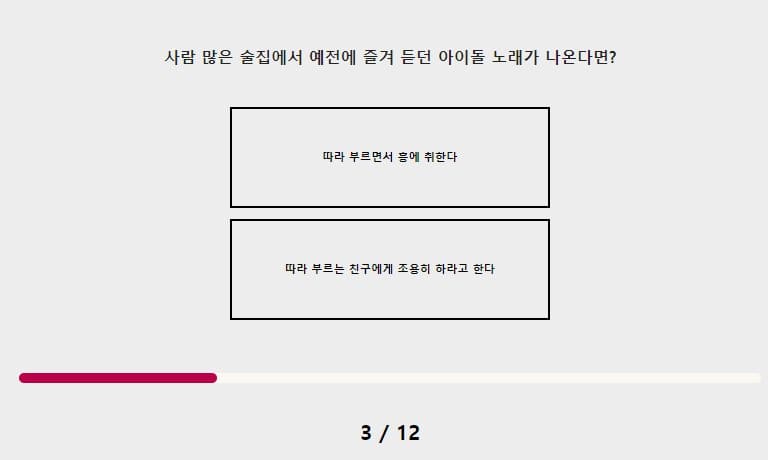 세 번째 사람 많은 술집에서 내가 아는 아이돌 노래가 나오면 따라 부르는 친구에게 조용히 하라고 하지 않을 것 같지만 그래도 따라 부르면서 흥에 취하진 않을 것 같아서요