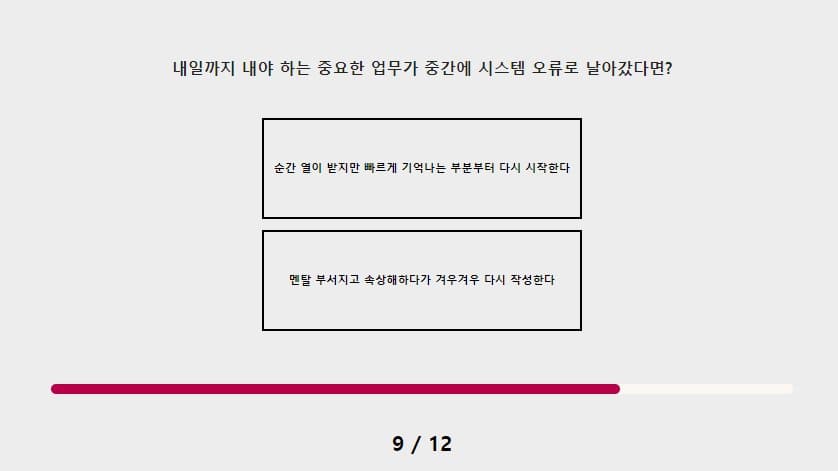 내일까지 해야하는 중요한 업무가 있는데 시스템 오류로 파일이 없어진다면 순간 열이 받겠지만 빠르게 기억나는 부분부터 다시 시작할 거예요 화가 나서 좌절한다고 바뀌는 게 없어지는 게 아니기 때문이에요