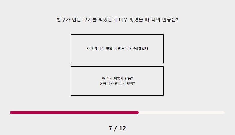 친구가 쿠키를 만들어 줬는데 나의 반응은 친구가 만들면서 얼마나 고생했을지 생각하면서 고마워 할 것 같아요.