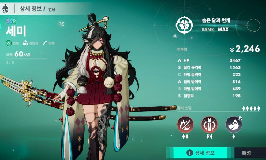 부족했던 번개 속성에 단비 같은 딜러가 추가되었습니다. 세미는 암살에 특화되어 있는 레인저 영웅이면서 PVE보다는 PVP에서 더욱 빛을 발휘할 영웅입니다.