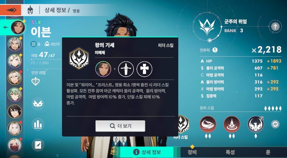새로운 빛의 탱커로 현존하는 탱커 리처드와 비교대상이 진행됩니다. 리더 스킬을 보유하고 있어 메이저와 레인저 시너지 효과가 기대되는 탱커입니다.