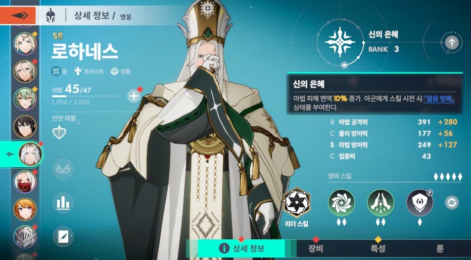 35 레벨 이후 각광받고 있는 캐릭터는 바로 리더스킬을 보유한 영웅으로 물속성의 레인저 캐릭터입니다.