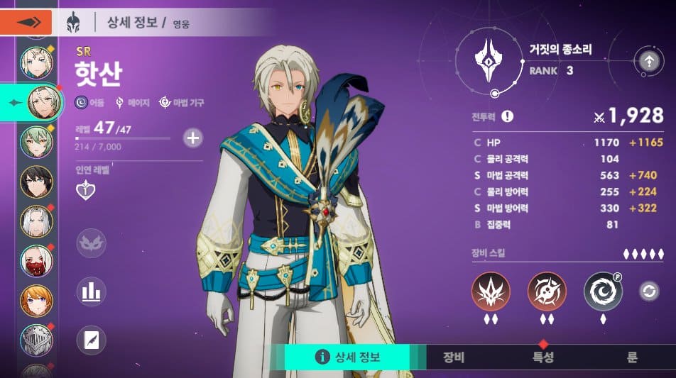 어둠속성을 가지고 있는 메이지 영웅입니다. 패시브의 형태를 보더라도 디버프를 보유한 적에게 가하는 피해량이 증가하는 스킬이 존재합니다. 스토리 클리어시 만났던 영웅으로 그 당시에도 상당히 까다로운 영웅이였습니다.