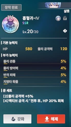 흡혈룬은 4세트 착용 시 전투 후 HP20% 회복하는 능력을 갖고 있습니다. 힐러가 한 명 필수로 전투에 참가하게 되지만 힐러의 역할을 대신해 줄 수 있는 룬을 착용하면서 게임 내 유지력을 극적으로 향상해 줍니다.