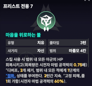 신속한 치유 행동 종료 시 2칸 이내 모든 아군의 HP를 회복시켜 줍니다. 패시브 형태의 스킬과 비슷한 효과를 지니고 있어 2 프리스트를 사용할 경우엔 필요 없는 스킬이 되지만 1인 힐러로 전투에 출전할 시에는 상황에 따라서 사용유무가 결정될 것으로 보입니다.