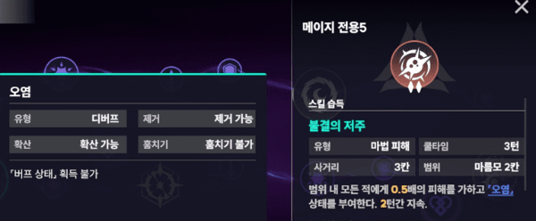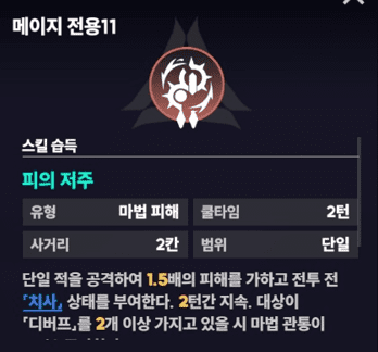 불결의 저주 마름모 2칸 이내 범위 내에 0.5배 피해를 가하고 오염 버프상태 획득 불가를 시켜주는 디버프 마법입니다. PVP나 PVE에서도 이제는 버프 스킬이 대중화되고 있는데 그것을 무력화시켜 주는 스킬이므로 높은 선호도로 보입니다.