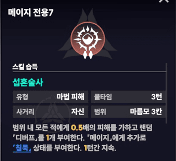 패시브를 보면 디버프를 보유한 캐릭터에게 본인의 마법 공격력과 마법 방어력이 15% 증가하게 됩니다. 그리고 행동 종료 시 3칸 이내 랜덤 3명에게 디버프 2개를 부여해 줍니다.