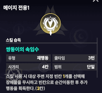 쌍둥이의 속임수 스킬은 샬롯이 가지고 있는 재행동 스킬과 같습니다 다만 스킬 코스트가 5개인 점을 고려해서 볼 때 필수적으로 챙겨야 하는 스킬이기도 합니다. 재행동을 통하여 상대방에게 빠르게 접근하여 광역 디버프를 사용하게 된다면 상대방이 준비하지 못한 상황에서 공격을 당할 수밖에 없을 것입니다.
