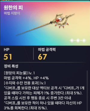 수지와수잔 전용무기로 원한의 피입니다. 전용무기를 보유 시 상대방의 디버프 개수에 따라서 피해량이 증가하게 됩니다. 또한 상대방이 디버프를 보유하고 있다면 본인의 체력도 회복하기 때문에 수지와수잔은 전용무기가 필수로 보입니다.