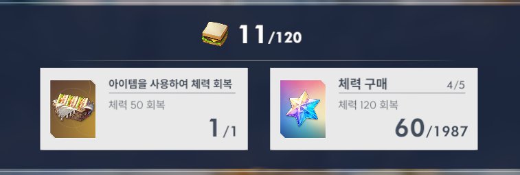총 5번의 다이아를 통하여 스태미나 120을 보충할 수 있습니다. 다만 우리는 첫 번째 40, 두 번째 60의 다이아만 사용하여 스태미나를 회복해 주는 게 가장 효율적입니다.