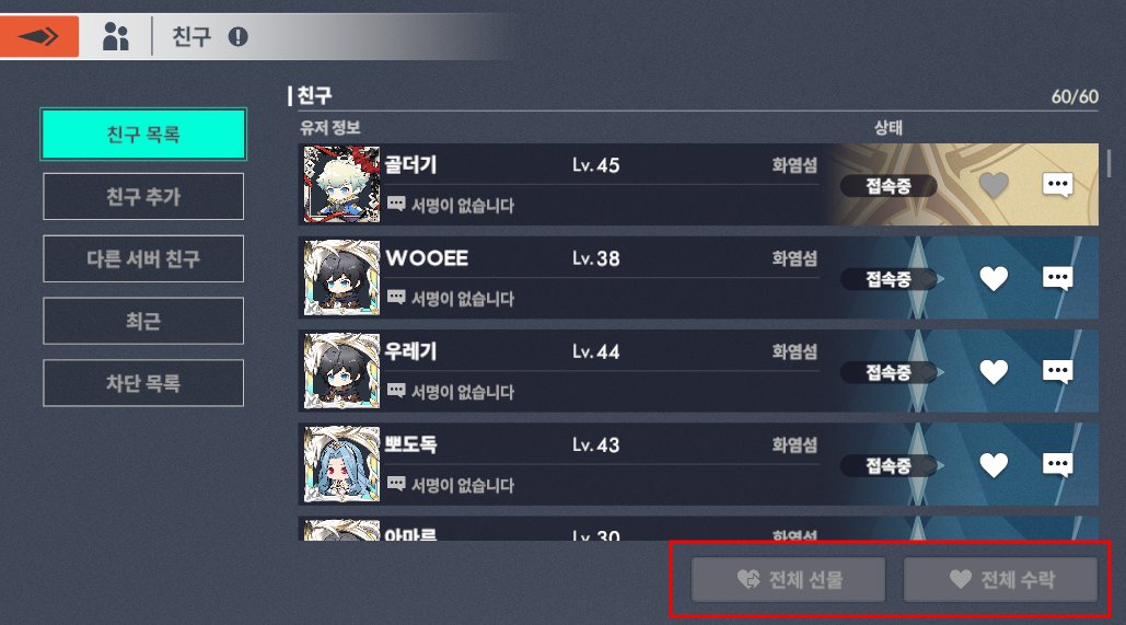 다른 게임에 비해서 친구의 최근 접속 시간과 서로 선물을 해줘야 스태미나를 지급해주지 않는 시스템은 플레이어들에게 선호되는 시스템입니다.