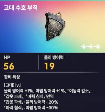 탱커형의 장신구 1 티어는 바로 고대 수호 부적입니다. 물리 방어력 5%, 마법 방어력 5%의 효과를 가지고 있고 가장 중요한 이동력 감소, 갑옷파쇄, 마력침식 3가지 능력치에 대해 면역 상태를 부여해 줍니다. 탱커의 역할은 아군들의 보호에 있으므로 물리 방어력, 마법 방어력 감소 디버프 영향을 미치지 않는다면 더욱 든든한 탱커로서의 역할을 책임질 수 있겠습니다.