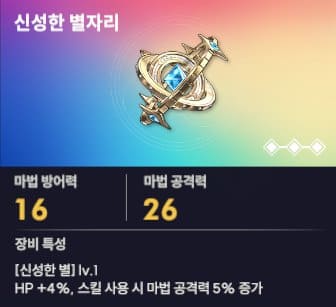 마법형의 경우 1 티어 장신구로 신성한 별자리를 추천합니다. 기본적인 능력으로 스킬 사용 시 마법 공격력이 증가하는 형태를 가지고 있습니다. 마법형의 경우 상대방에게 디버프와 마법방어력을 신경 쓰이도록 하는 역할을 하고 있습니다.