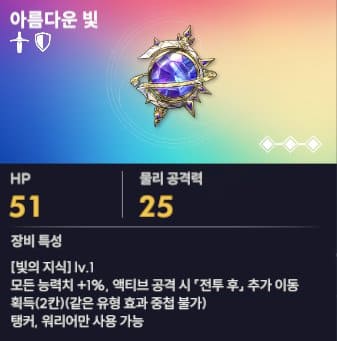 아름다운 빛 탱커와 워리어가 사용하는 장신구로 모든 능력치 5% 증가하고 공격 전후 투 추가 이동 2칸의 옵션이 주어집니다. 워리어의 경우 상대방을 공격 후 탱커의 주변으로 이동하고 턴을 종료하면 안전하게 적의 턴을 넘길 수 있습니다. 특히나 샬롯의 경우 상대방을 압살 시킨 후 탱커 주변으로 이동하면 암살을 당할 경우의 수도 줄일 수 있으므로 추천하는 장신구입니다.