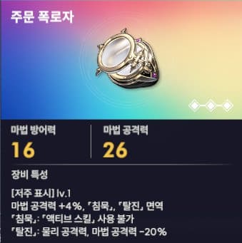 마법사 한정으로 2 티어의 장신구로 추천합니다. 마법 공격력 증가와 침묵, 탈진 면역을 가지고 있는 장신구입니다. PVP의 경우 상대방이 광역 디버프로 공격을 할 경우 침묵 스킬을 맞은 아군들은 액티브 스킬을 사용할 수 없으므로 일반 공격밖에 할 수 없습니다. 그만큼 승패를 좌우하는 경우가 큰 침묵을 완전히 배제시켜 줄 수 있는 아이템입니다. 마법사의 경우 주문 폭로자를 갖고 있다면 고초월을 통하여 장비하시는 것도 좋습니다.