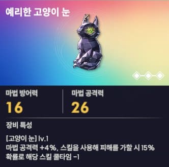 예리한 고양이 눈의 장신구도 마법사에게 굉장히 좋습니다. 개인적으로 핫산이 주로 이용하고 있는 장신구입니다. 마법공격력 8%의 증가와 30% 확률로 스킬 쿨타임을 감소시켜 줍니다. 광역 디버프의 역할을 가지고 있는 핫산은 모래시계 눈과 같이 고양이 눈 장신구를 사용하면 스킬을 사용할 때마다 쿨타임 감소효과를 얻어 지속적인 광역 디버프를 사용할 수 있습니다. 광역 디버프의 역할은 PVP에서 판도를 뒤 흔들 수 있는 스킬이므로 직접 착용해 보시면 느끼실 수 있는 아이템입니다.