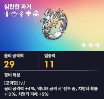 공격형으로 모든 능력치가 공격에 초점이 맞춰져 있는 장신구로 심란한 과거가 있습니다. 한 번의 공격으로 적을 쓰러트릴 수 있는 장신구로 물리공격력 8%. 치명타확률 20%, 치명타 피해 10%를 증가시켜 줍니다. 착용 클래스도 탱커를 제외하고 모두 가능하므로 공격형 장신구 중 1 티어의 자리를 갖고 있습니다.