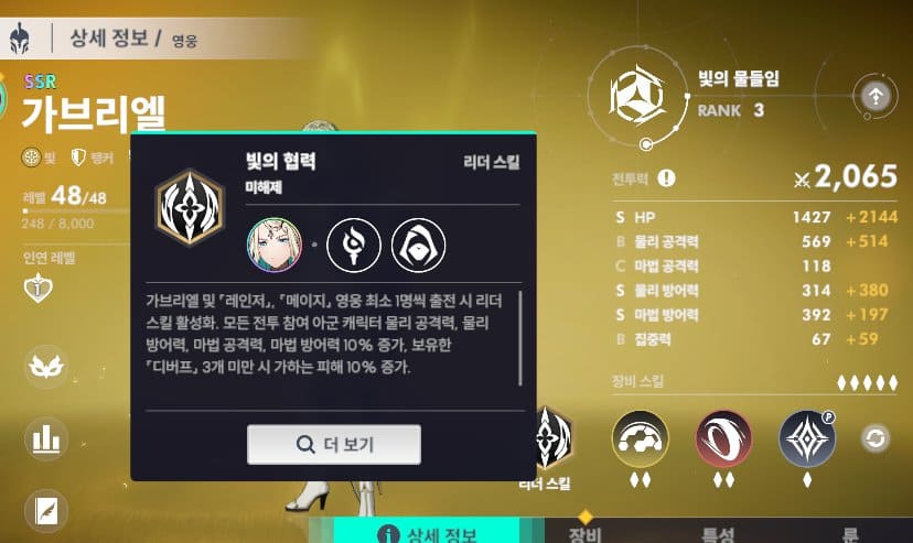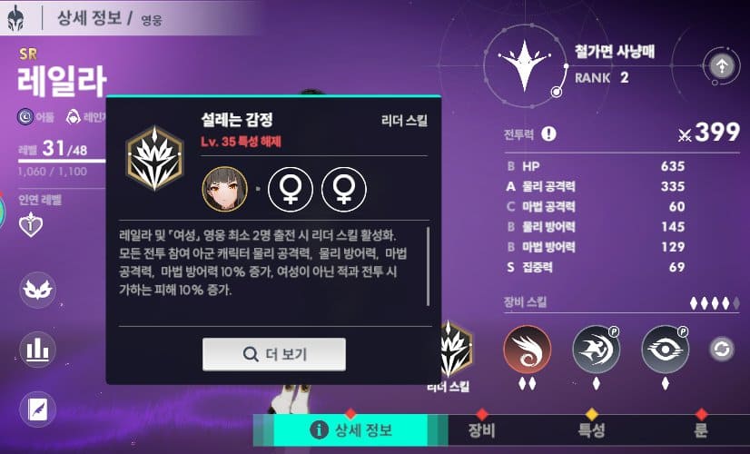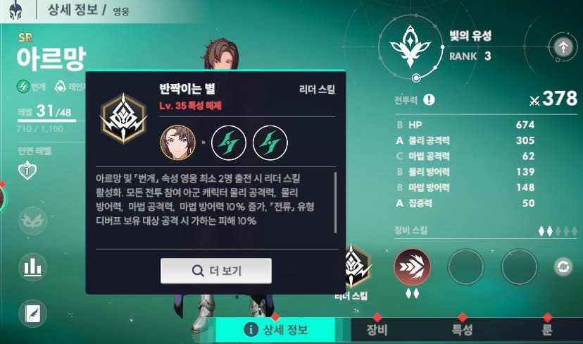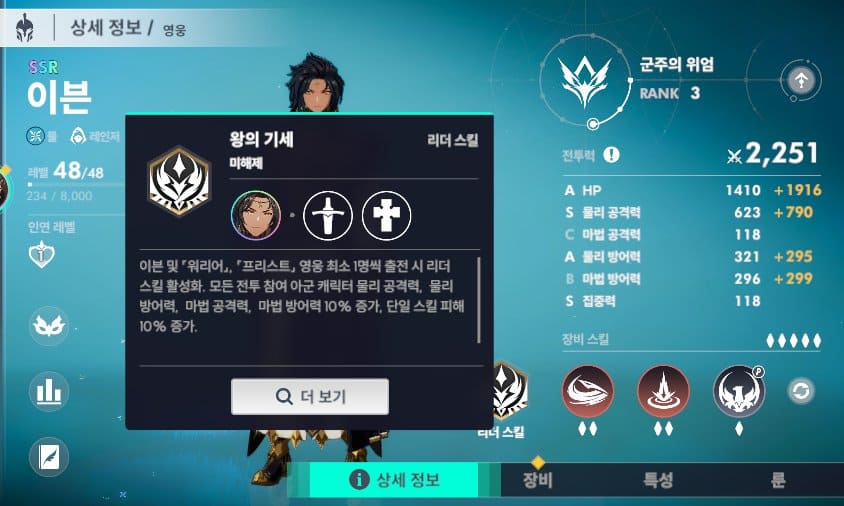 리더스킬 활성화 조건이 탱커와 프리스트로 스킬 활성화 시키기 어렵지 않고 35 레벨 이전까진 주인공을 키우시다가 다른 영웅으로 옮기더라도 믿고 가져가야 하는 캐릭터입니다.