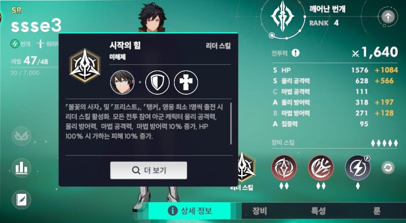 시작의 힘이라는 리더스킬로 탱커와 프리스트가 같이 전투에 참가하게 되면 HP 100% 시 가하는 피해 10%를 증가하게 됩니다. 주인공 캐릭터는 무료로 지급해주는 캐릭터이며 앞의 공략들에서 말씀드렸듯이 주인공이라는 캐릭터의 능력치가 상당히 높은 편이라 키워야 하는 이유가 한 가지 더 생겼습니다.