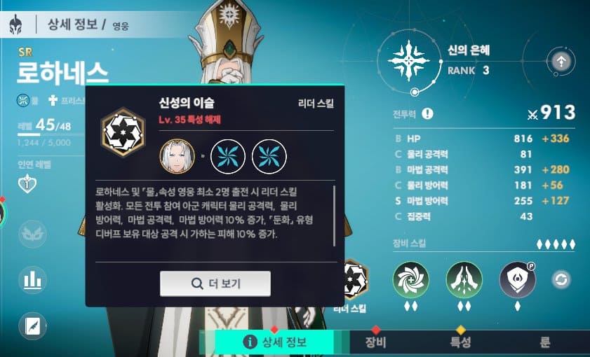 SR 영웅으로 물속성 영웅 2명과 같이 전투에 출전하면 리더스킬이 활성화됩니다. 기존 공략에서 로하네스는 SR 등급으로 SSR 만큼의 좋은 능력을 보유하고 있다고 말씀드렸습니다. 패시브를 통하여 아군의 반격 대미지 감소로 초반과 후반까지 사용하는 힐러입니다.
