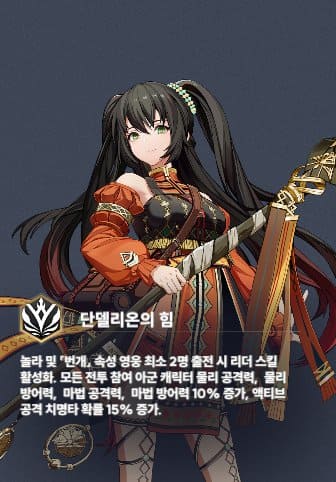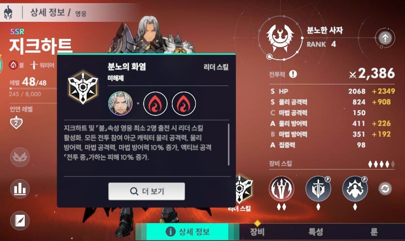 불속성의 단연 1등 선호도 영웅인 지크하트도 리더스킬을 보유하고 있습니다. 같은 속성 2명이 출전해야 리더 스킬이 발동하는 조건이 조금 아쉽긴 합니다.