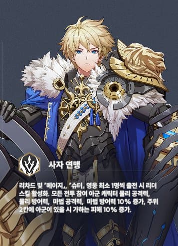 오픈과 동시에 픽업 캐릭터로 출시한 리처드는 리더 스킬 활성화 조건으로 메이지, 슈터를 조합으로 출전하면 주위 2칸에 아군이 있을 때 가하는 피해 10% 증가의 효과가 있습니다. 초반 픽업에서 에리카와 리차드의 조합이 굉장히 강하였기 때문에 리처드의 경우 위자드에 선호하는 영웅이 있다면 좋은 파티를 구성할 수 있습니다.