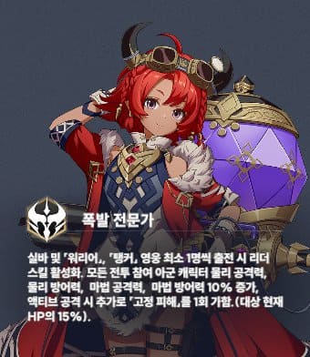 불속성 원거리 딜러로 워리어와 탱커를 출전시키면 리더 스킬이 활성화됩니다. 액티브 공격 시 추가로 고정피해를 입힐 수 있습니다.