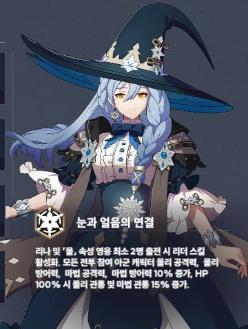 물 속성의 위자드 직업으로 물속성 2명의 영웅과 같이 출전하면 HP 100% 시 물리 광통과 마법 관통 15%의 증가 효과가 발생합니다. 불속성 던전에서 좋은 활약을 할 수 있습니다. 샬롯은 고정 워리어 이므로 좋은 조합을 선택할 수 있습니다.