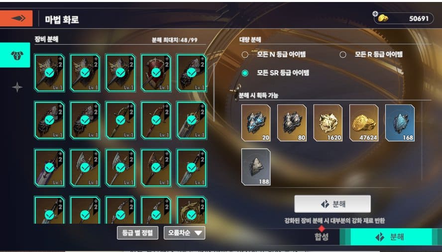 약속의 영지 마법회로에서 사용하지 않는 SR 장비를 분해할 수 있습니다.