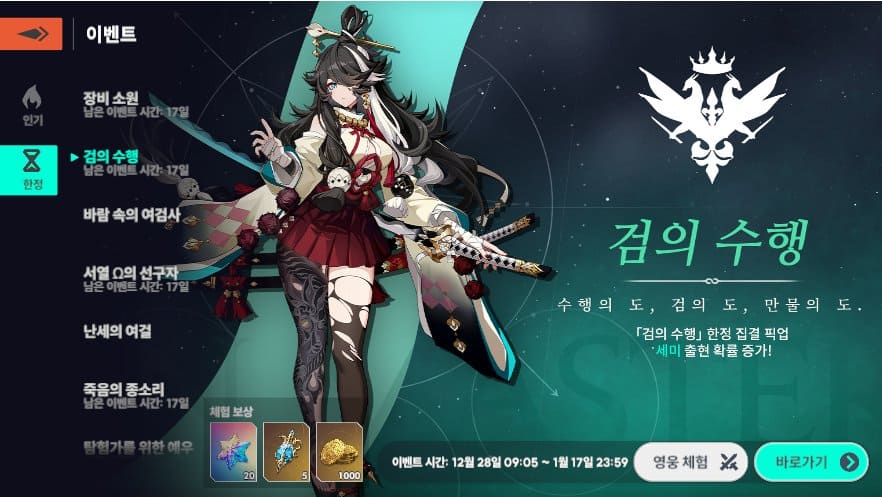 이벤트 한정에서 현재 진행하는 픽업의 캐릭터는 영웅 체험을 통하여 체험 보상을 지급하고 있습니다.