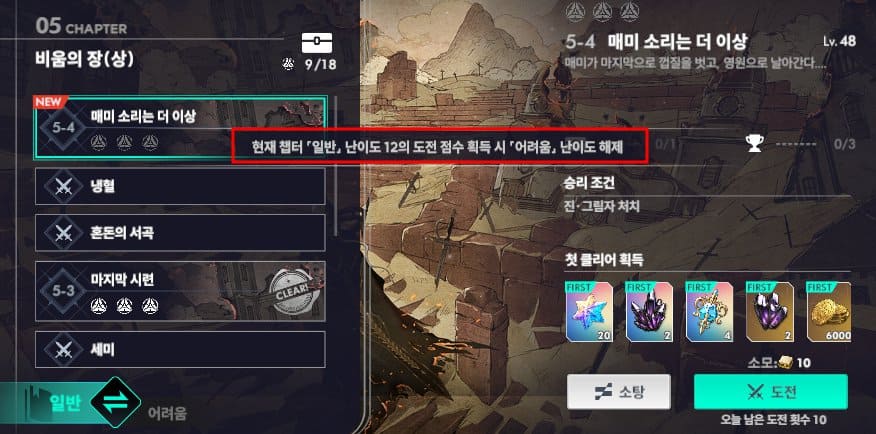 일반 난이도 12점의 도전 점수를 획득하면 어려움 난이도가 개방됩니다.