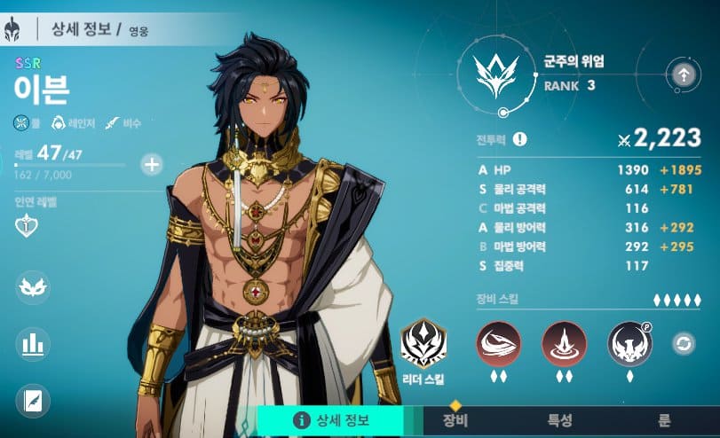 주인공, 벨렛, 아비아의 경우 6 RANK 기준으로 SSR 캐릭터 4 RANK의 스텟과 비슷하게 분포되어 있어, 무료로 지급해주는 주인공의 캐릭터들도 많은 곳에서 활약을 할 수 있겠습니다.