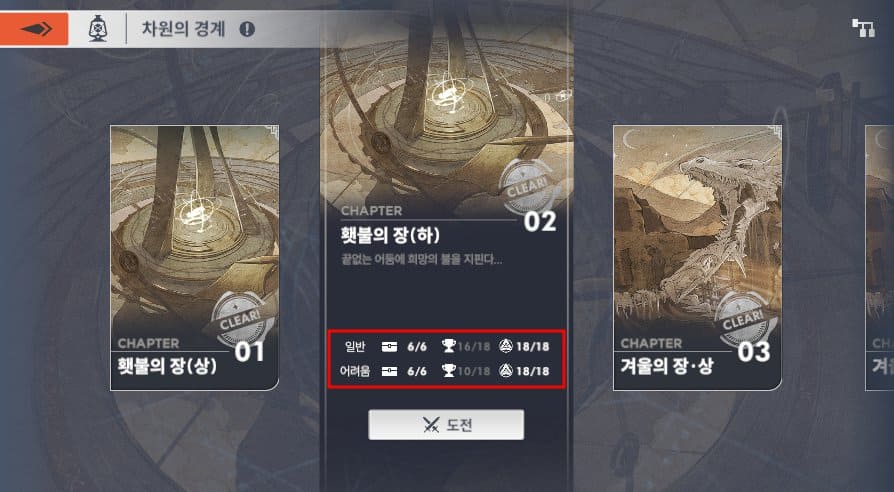 차원의 경계는 메인 스토리 챕터 1개당 일반과 어려움으로 나뉘어 있습니다.