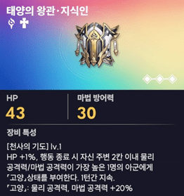 행동 종료 시 주변 2칸 이내 공격력이 높은 아군 1명에게 공격력 20%를 증가시켜 줍니다. 강력한 대미지를 구사하는 메이지의 직업으로 행동이 종료하고 아군에게 까지 공격력을 증가시켜주는 효과를 주는 투구는 현재 1 티어의 투구입니다.