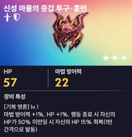 위의 신성마물의 중갑 투구 홍련이 2개 이상 존재한다면 탱커에게도 장착해 주시는 게 좋습니다. 아무래도 가장 많은 공격을 받는 탱커의 직업 특성상 HP 회복의 효과는 비교할 수 없는 가치가 있습니다.