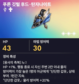 행동 종료 시 주변 2칸 이내 물리 방어력이 높은 아군 1명에게 물리 방어력 20% 증가시켜주는 효과입니다. 물리 공격이 높은 던전을 클리어할 때 도움이 되는 아이템입니다.