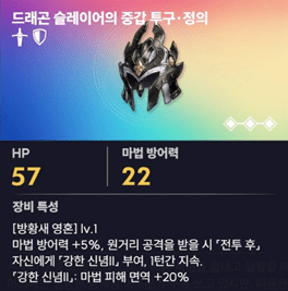 원거리 공격을 받을 시 마법 피해 면역 20%를 얻는 효과입니다. 원거리 공격을 받는 이라는 조건부가 존재합니다만 탱커로서의 역할을 수행하기에 좋은 옵션입니다.