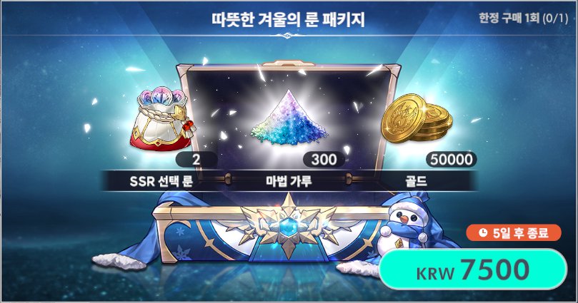따뜻한 겨울의 룬 패키지 구매 시 SSR 선택 룬 2개, 골드 5만, 마법 가루 500개를 지급해 줍니다.
