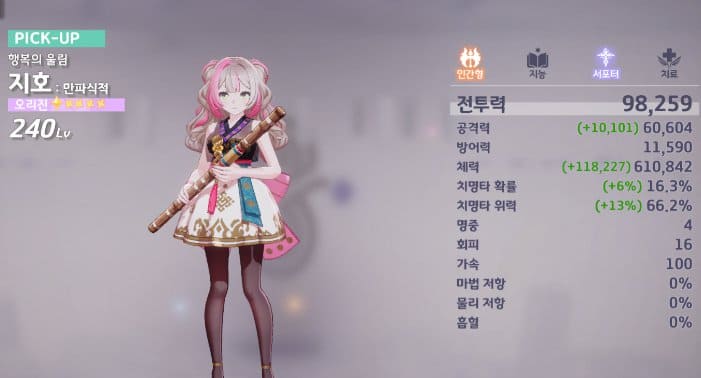 인간형 서포트로 현재 픽업을 진행중입니다. 힐러와 딜러의 중간 역할을 하고 있습니다. 개인적으로는 사용하고 있으며 단일 힐러로서도 사용 가능할 거라 보입니다.