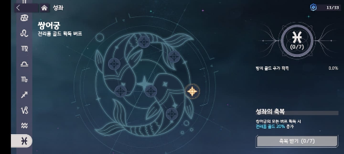 초반에 중요하게 사용되는 골드 획득량을 올릴 수 있는 성좌가 존재합니다 쌍어궁의 성좌로 방치 골드 추가 획득량을 30% 증가시켜줍니다. 성좌의 축복의 경우에서도 전리품 골드가 추가로 20%가 증가합니다.