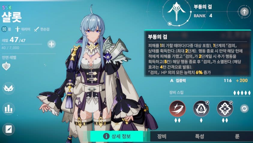 암흑 속성의 워리어 캐릭터로 샬롯, 지크하트가 있는 경우에는 조금 선호도에서 밀리는 상황입니다. 이유는 스킬 자체가 스토리를 해결하는 스킬보다는 PVP에 선호되는 스킬이 많습니다.
