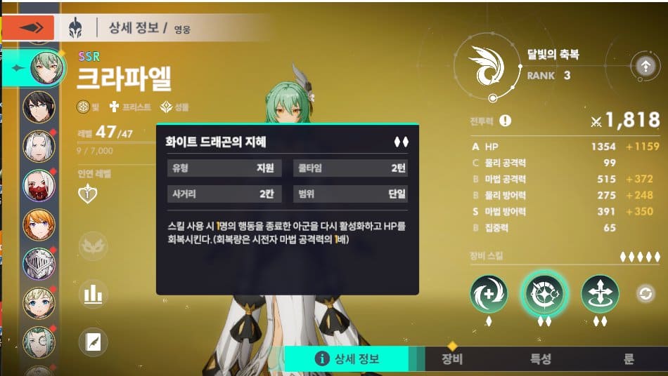 SRPG의 게임 특성에서 재행동을 부여해주는 스킬을 보유하고 있기 때문입니다. 샬롯과 더불어 크라파엘이 있는 파티와 없는 파티는 게임 체감이 확연하게 느껴지는 영웅입니다.