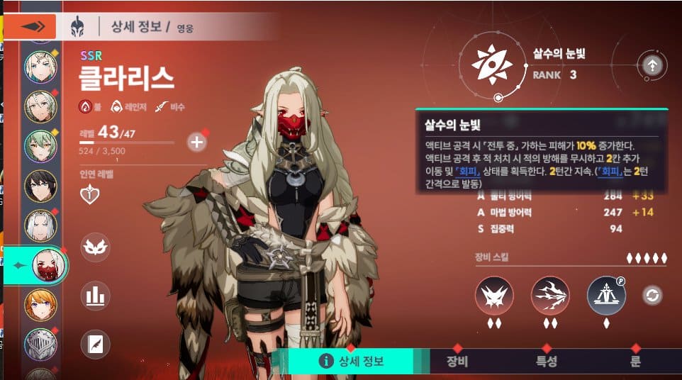 어둠속성을 가지고 있는 메이지 영웅입니다. 패시브의 형태를 보더라도 디버프를 보유한 적에게 가하는 피해량이 증가하는 스킬이 존재합니다. 스토리 클리어시 만났던 영웅으로 그 당시에도 상당히 까다로운 영웅이였습니다.