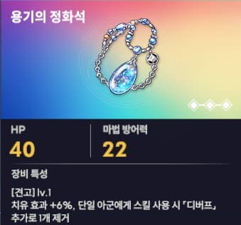 프리스트의 경우 1 티어 장신구로 용기의 정화석이 있습니다. 치유효과 12%와 아군의 디버프를 제거해주는 옵션이 있습니다. 게임 후반부로 갈수록 상대방이 사용하는 디버프 스킬이 많아지고 있습니다. 아군 힐러의 역할은 체력을 보충해 주면서 디버프를 제거해주고 게임의 유지력을 높여주기 때문에 1 티어의 장신구 역할을 가지고 있습니다.